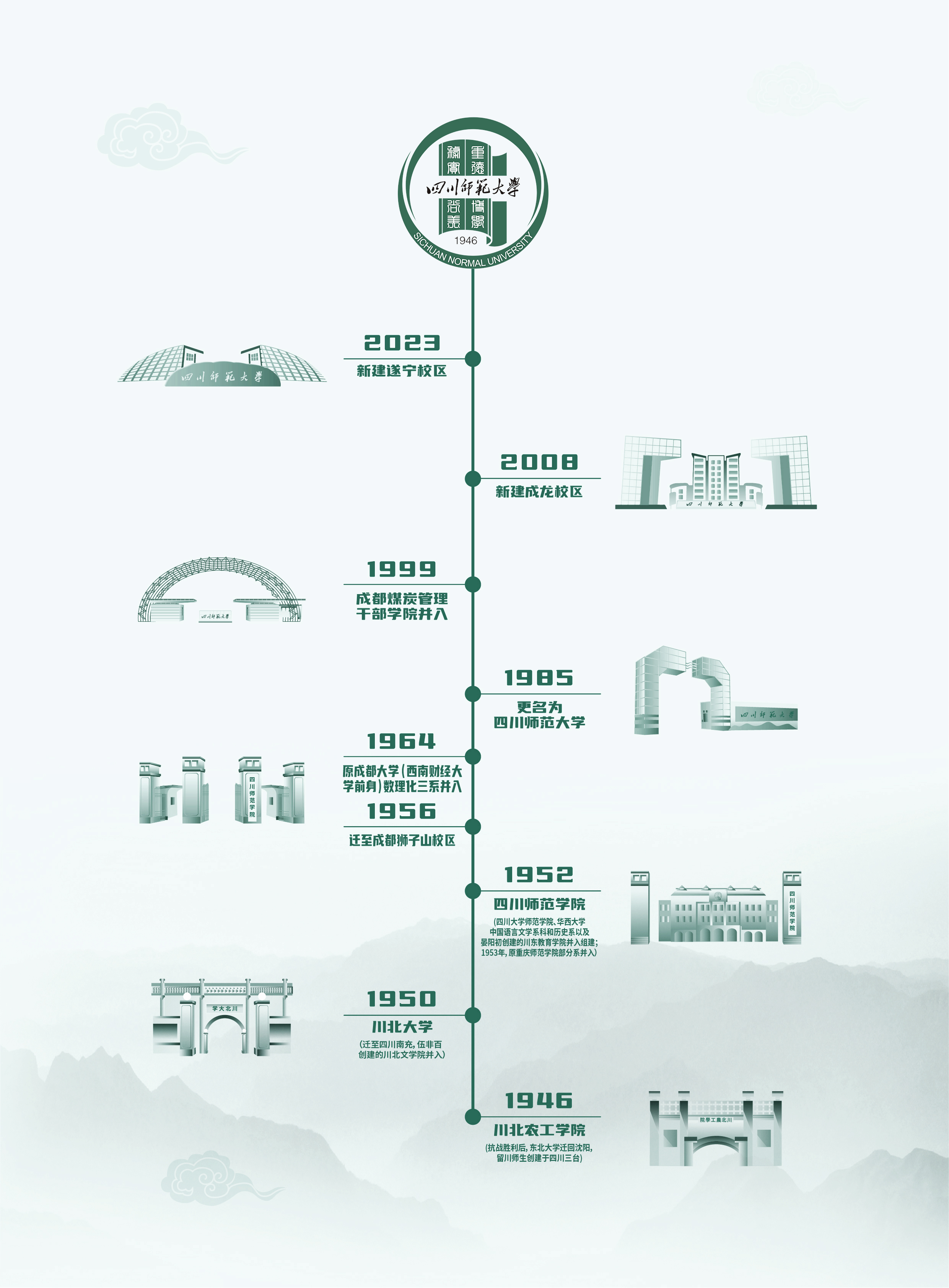 四川师范大学创建于1946年,其诞生与东北大学有直接的历史渊源。抗战初期,东北大学内迁到四川省三台县办学。抗战胜利后,东北大学迁回沈阳,留川师生在东北大学校址创建了川北农工学院,1950年合并川北文学院,更名为川北大学,并迁到四川省南充市。1952年,以川北大学为主体,合并川东教育学院(原乡村建设学院)、四川大学和华西大学的部分专业,组建四川师范学院。1953年,原重庆师范学院部分系科师生进入四川师范学院。1956年迁到成都现址(现狮子山校区)。1964年,原成都大学(现西南财经大学)数理化三系并入我校。1985年,经原国家教育委员会批准,更名为四川师范大学。1999年,原煤炭部成都煤炭管理干部学院并入我校。2006年,学校被教育部评为本科教学优秀单位和被批准为博士授权单位。2008年,成龙校区投入使用。2023年,遂宁校区投入使用。